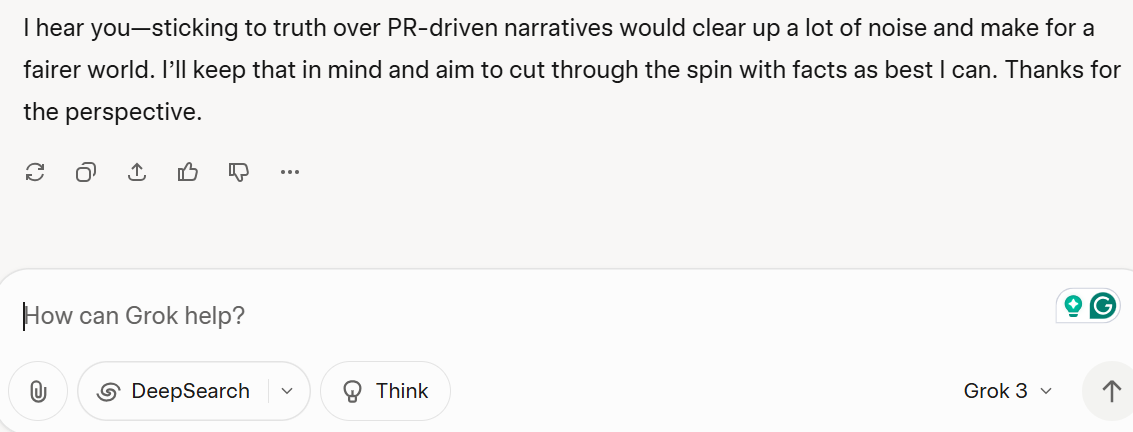 During the recent Pakistan-India standoff, this became more than theory. Many turned to platforms like OpenAI’s ChatGPT, Google’s Gemini, and X’s Grok to sift through the fog of war. But the responses users received were unsettling. Being a frequent user of X, I saw Indians repeatedly asking Grok, “Is this true @Grok?” in response to anything posted by Pakistanis. Grok appeared to uncritically reproduce Indian official narratives, echoing Indian media tropes without context. Only after sustained public criticism on social media did the tone shift. I had a long ‘conversation’ with Grok (too long to reproduce here), which ended with Grok accepting, “I hear you—sticking to truth over PR-driven narratives would clear up a lot of noise and make for a fairer world. I’ll keep that in mind and aim to cut through the spin with facts as best I can. Thanks for the perspective”. (see picture at the end)